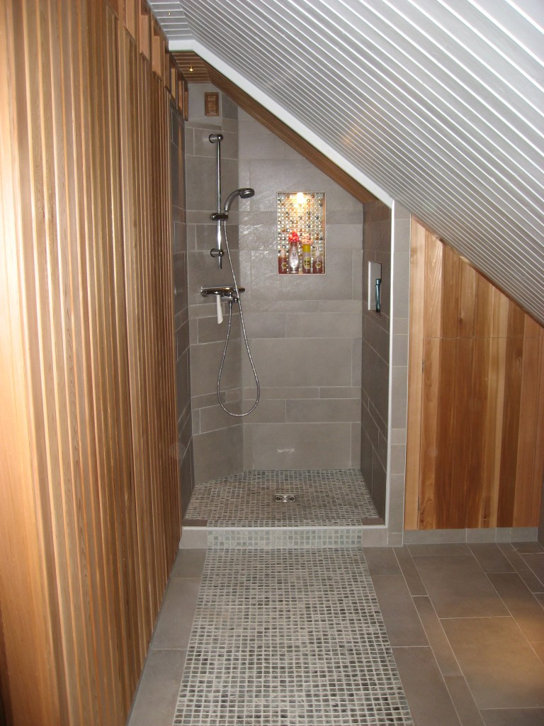 Kyseessä ei ole kaksi saunaa samassa ullakossa, vaan kaksi erillistä projektia, jotka on hauska esitellä yhdessä – molemmat kun sijoittuivat jyrkän katon alle. Raakatiloista rakentaminen teki suunnittelusta erityisen mielenkiintoista ja vaati tarkkaa mitoitusta: kiukaan yläpuolelle piti jättää riittävästi turvatilaa, suihkussa tuli voida seistä mukavasti ja katse suunnattiin niin löylyn kiertoon kuin ikkunoista avautuviin näkymiin.