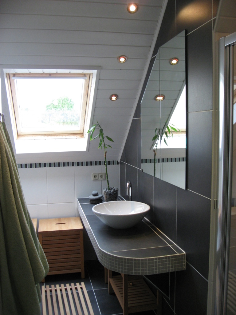 Toisessa projektissa keskityttiin erityisesti säilytysratkaisuihin. Uutta seinää hyödyntämällä peilikaapista saatiin näyttämään kiinteältä peililtä, ja lappeen alle rakennettiin lisää säilytystilaa. Molempien kylpyhuoneiden suihkutiloihin toteutettiin lisäksi seinään upotetut hyllyt arjen tarpeita varten.
