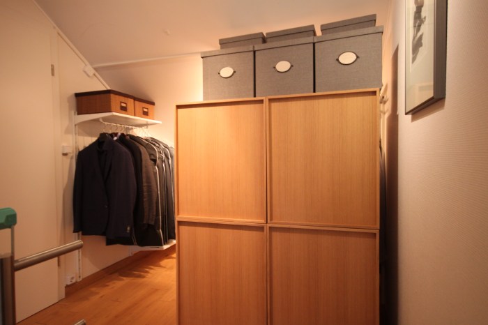 Toisessa tilassa haasteena oli jyrkästi laskeva katto. Se oli pimeä ja tarvitsi lisää valoa ollakseen toimiva. Perhe halusi säilyttää tilassa jo olevan kaapin. Ensimmäinen askel oli jälleen käydä kaikki laatikot läpi ja päättää, mitkä tavarat olivat edelleen tarpeellisia ja kuuluivatko ne tähän tilaan vai toiseen varastoon. Kun tämä prosessi oli valmis, suunnittelin molemmille vanhemmille omat hyllyjärjestelmät tilan molemmin puolin, tarjoten riittävästi ja oikeantyyppistä säilytystilaa.